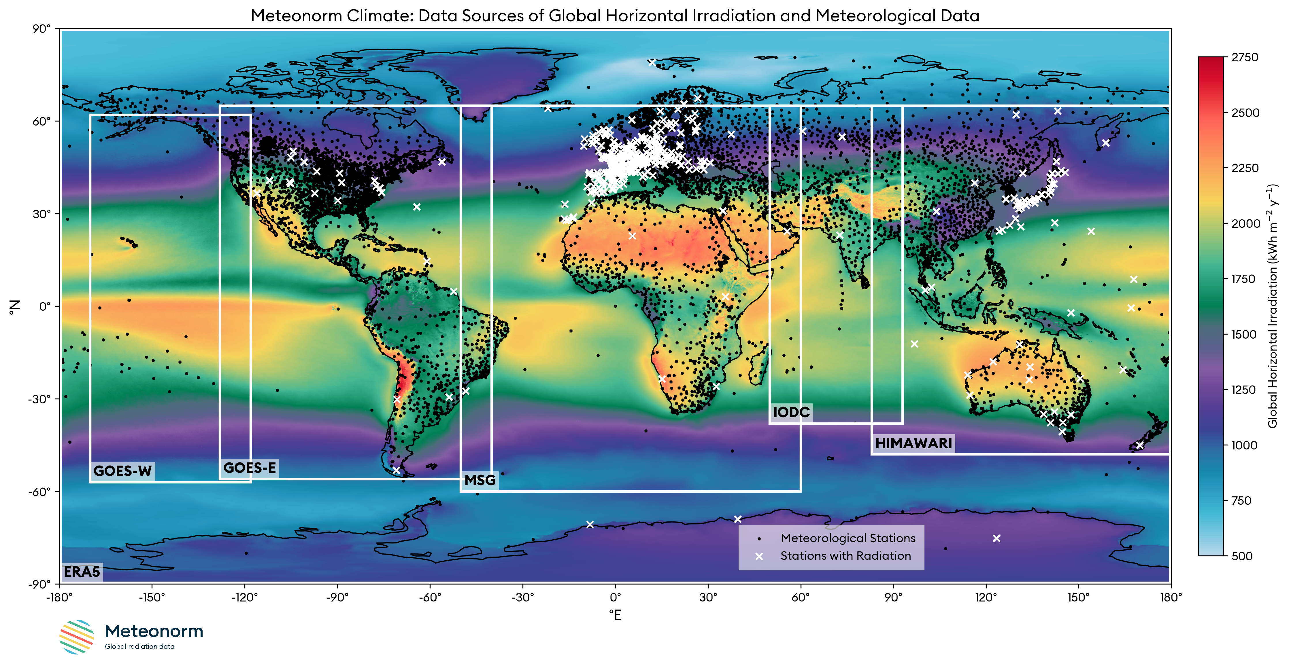 Satellite data is the primary source for irradiance in regions without dense station networks. Meteonorm incorporates data from five geostationary satellites, providing nearly global coverage (see Figure 1).